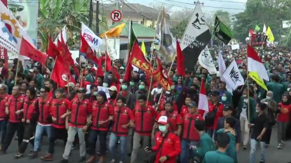 “Kami juga menolak RUU Ketenagakerjaan. Hidup buruh, hidup mahasiswa,” ujar seorang orator dalam demo tersebut.